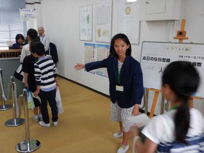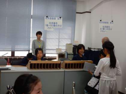 区役所では,住民登録や住民税を納めてもらうため,窓口へのご案内をしています。121人全員が訪れる場所なので大きな声でご案内をし,正確に住民登録をしています。