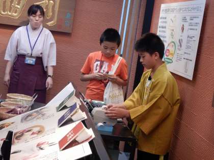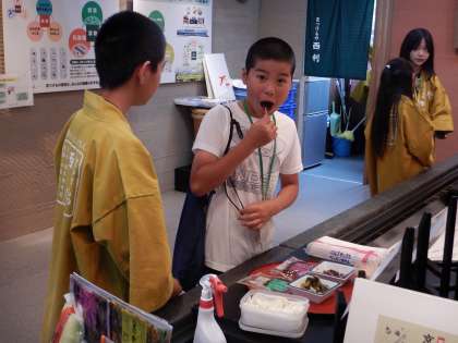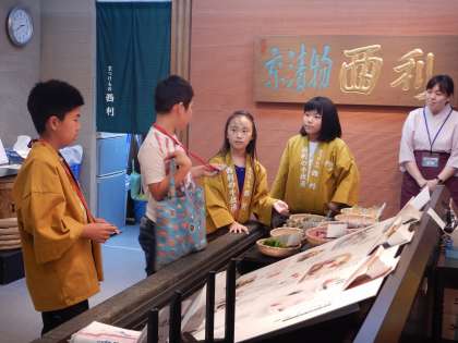 京都伝統食品会社の様子です。店頭で声をかけたり,実際に試食をしてもらい,おすすめを紹介したりして,お客様にお買い上げしていただいています。「このつけものは,さっぱりしていておいしいですよ!」と上手に接客をしていました。レジも正確に落ち着いて対応しています。