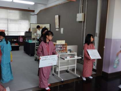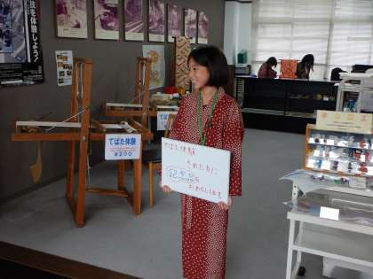 京都伝統産業の会社の様子です。かわいい,きれいな制服で接客をしています。最初はドキドキしている様子でしたが,第三ピリオドになると店頭に出て,実物を見せながら声をかけていました。機織り体験も丁寧に教えている姿が印象的でした。