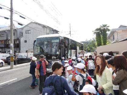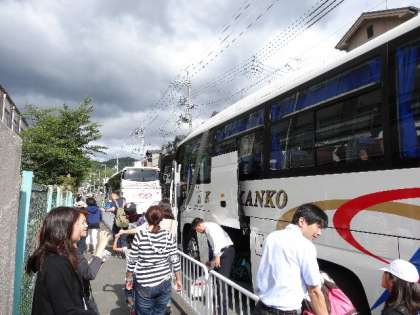 バスに乗車します。112名,欠席なく行ってきます。