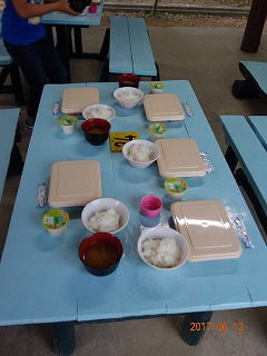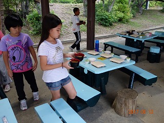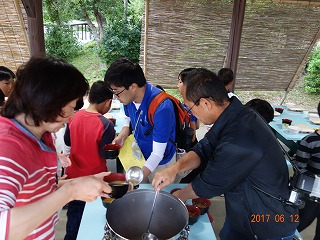 お味噌汁を子供たちに渡す、スイカマンに似ているU先生も、