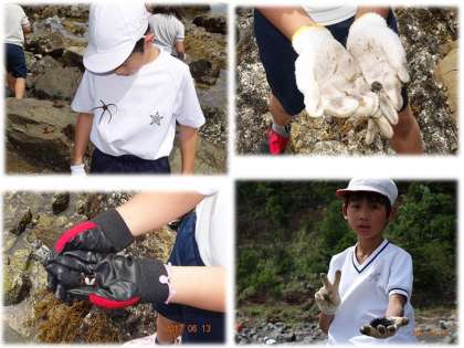 何やら、ヒトデのような違うような生き物を見つけて、ワッペン代わりに服につけます。何となく、大宮の校章の形に似ていませんか?