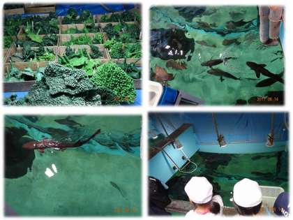 サンゴ礁の模型(水槽の中にある)を見たり,水槽の上部から餌やりの体験をしたり。