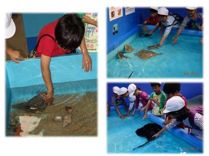 子どもたちに大人気だったのは,魚を実際に触れるコーナー。エビや,エイをさわることができます。