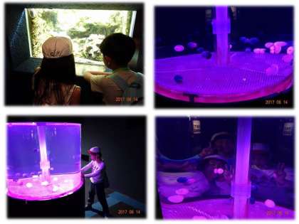 写真を撮れと言われて,クラゲを撮ると,円筒の水槽の向こう側から,子どもたちがこちらを眺めています。