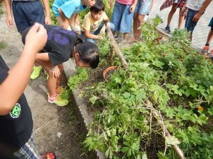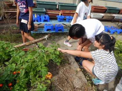 子どもたちが学校で育てた植物でもおしべとめしべが一緒になっているものや雄花,雌花と分かれているものがたくさんありました。花の中をよーく見てどちらのタイプか観察をしています。