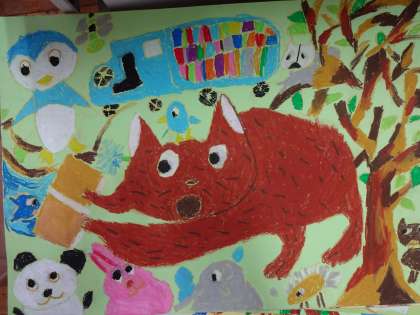 たくさんの動物たちが集まってきているところを描いています。