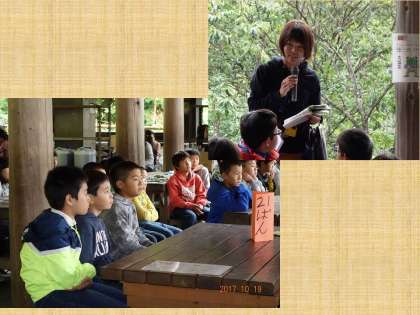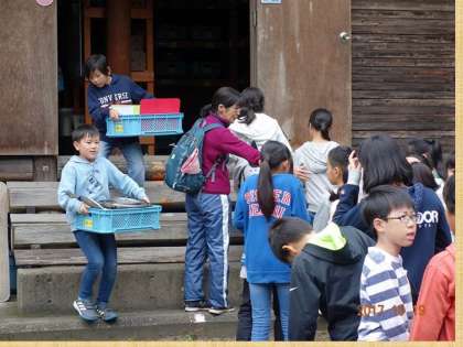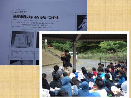 調理器具などを取りに行って、その近くでは「かまど」の係の子たちを前に、H先生がマキの組み方をレクチャー。基本、説明書に書いてある通りにすれば火が点くとのこと。「ほんまに点くんかいな」と聞きますと、「点きます!」の言い切りの返答。その自信の根拠はなんだろう・・・