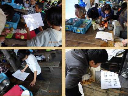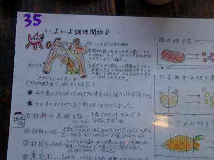 説明書といえば、調理グループも、説明書を持っていて、しきりに読みながら作業を進めています。あまり「先生、どうするんですか?」と聞く子がいないのは、説明書のおかげなんだ。