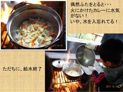 カレーに水を足さないまま火にかけた模様。給水係が出動して、水を入れ、任務完了。
