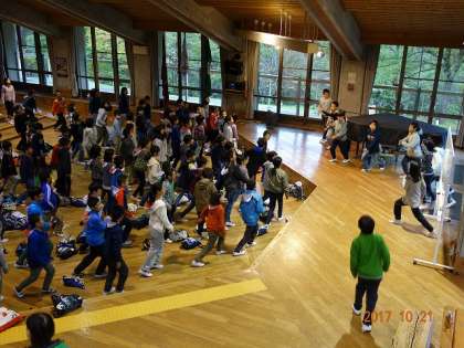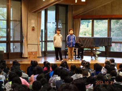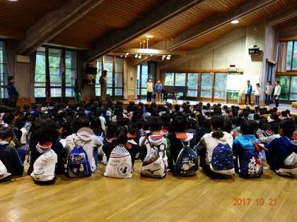 朝の集いは、市内の下鳥羽、葵小学校の3校合同で行いました。
