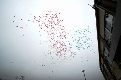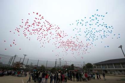 「1 2 3」の掛け声とともに,一斉にバルーンが手から離れていきます。