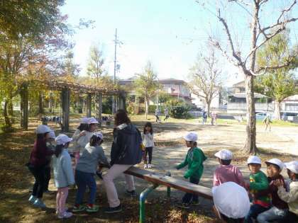 生活科で春・夏・秋とそれぞれの季節に公園の様子を見に行っています。夏と比べて,木々が色づいたり,落ち葉やどんぐりを見つけたりしました。遊び時間も取りました。先生も子どもたちと一緒になって遊んでいます。