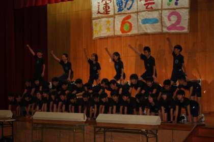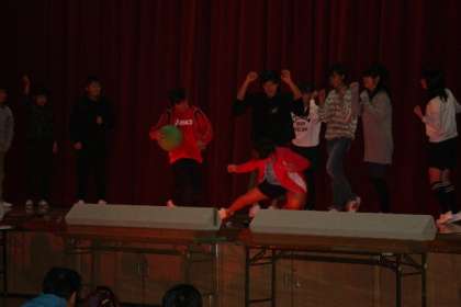 組体操にむかって,みんなが困難を乗り越えていく設定。迫真の演技もさることながら,演出の団体演技は,舞台の高さがあるので,運動場とは違う緊張感もあったことと思います。見事な出来栄えに,大きな拍手がおこりました。