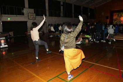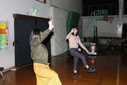 楽しそうに踊っているように見えるのは,養護の先生二人。一瞬,子どもが席を離れて遊んでいるのかと思いきや,子どもと一緒にゲームに没頭中。