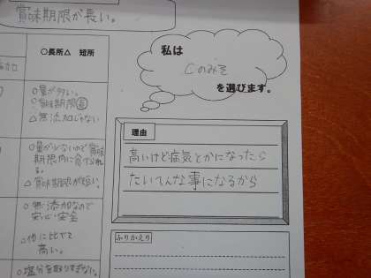 お買い物名人になろうということで家族のためにどんな味噌を購入したらいいか学習をしました。購入するために,パッケージなどの情報を見たり,家族のことを考えたり…友だちの考えも聞く中で,家族の一員として味噌の選び方を考えていました。