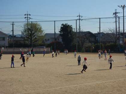 運動場では,1年生がキャーキャー言いながら走り回っています。