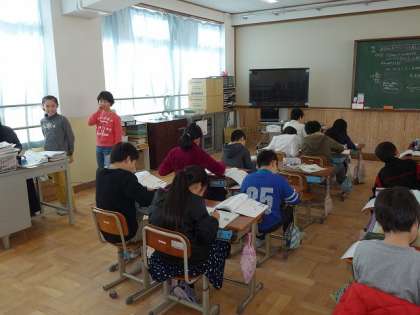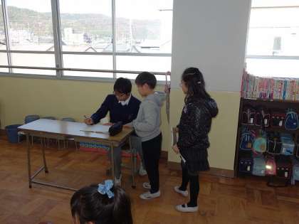 西賀茂中学校の生徒さんが,チャレンジ体験で本校に来てくれています。今日は,4年生の教室に入って,ノートのチェックを手伝ってくれています。