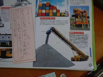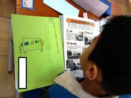 自動車の図鑑を見ているんですね。車の特徴を,書いているんです。