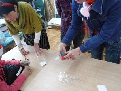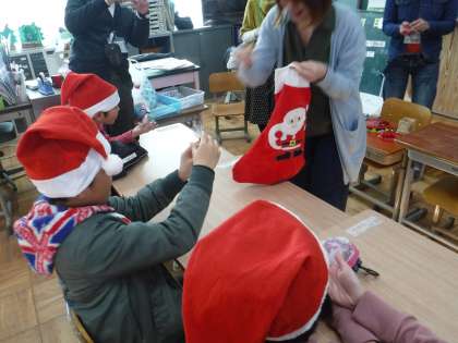 お話だけでなくステキなプレゼントもありました。「あわてんぼうのサンタクロース」の歌を演奏つき,それと「ツリーの立体パズル」のプレゼントした。手作りのクリスマスカラーのプレゼントでした。毎年,工夫されたプレゼントをありがとうございました!子どもたちも大喜びでした。