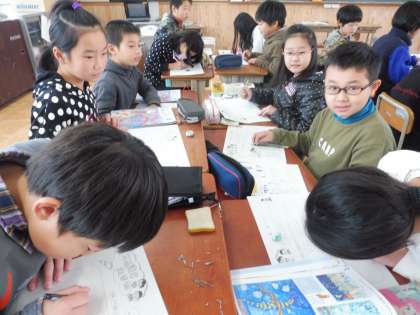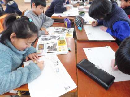 初めての木版画ということで,今回は,「不思議な生き物」というテーマで学習を進めてきました。実際に存在する生き物に一工夫。近くのお友だちと楽しみながらアイデアスケッチをしました。