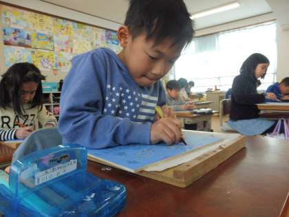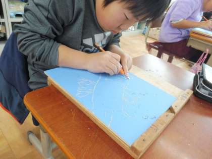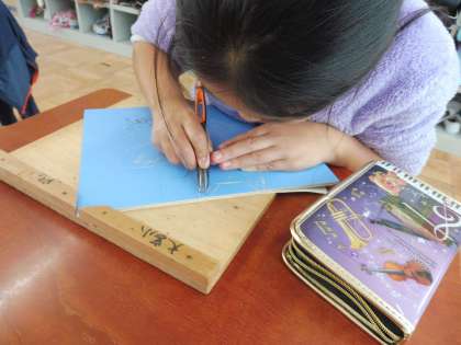 丸刀・三角刀・平刀で試し彫りをしてから,いよいよ本番です。まっすぐ彫ったり,太さを同じように彫ったりすることに苦戦していましたが,集中して取り組むことができていました。