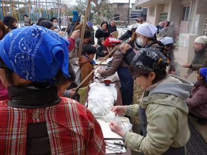 焼けた餅をもって,ぜんざいの集配所に続々と人が集まってきました。