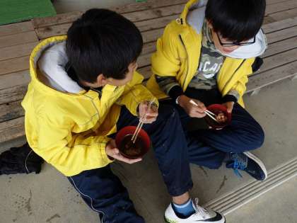 温かいおぜんざいにお餅を入れて,美味しそうに食べていますね。