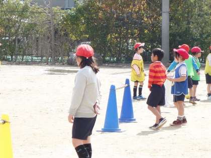 運動場では,1年生が元気にサッカーをしていました。
