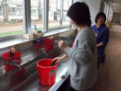 きれいな水に入れ替えるだけでなく,バケツの内側や外側もきれいにゴシゴシ磨きました。校舎にある全部の防火バケツをきれいにして,スッキリやり切った様子でした。