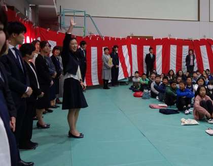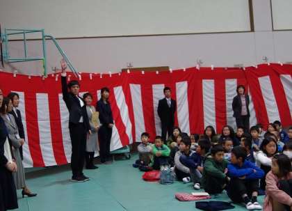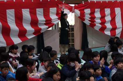 前に名前を呼ばれた先生をまねして,「ハイ!」