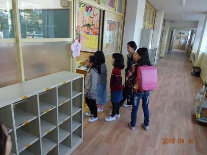上級生が心配そうに,教室まで1年生を送ってきて見守っています。もう,お母さんの気分!