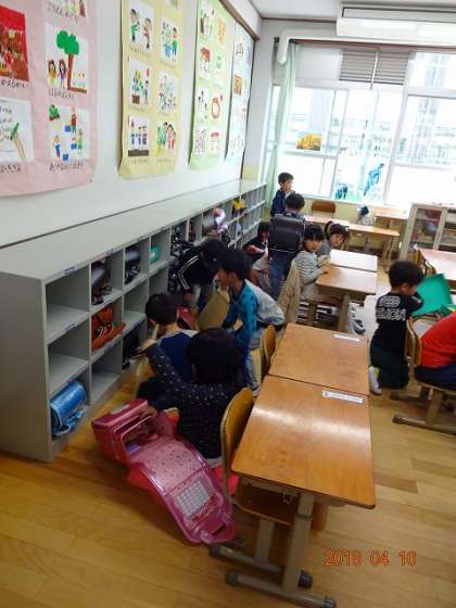どの教室も,ランドセルをロッカーに入れるのに,四苦八苦。
