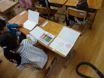 クラスでは絵を描いていますね。みんなちゃんと座って,先生のお話を聞いています。