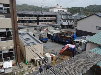 窓の外を見てみると,大きなトラックが北校舎の所に停まっています。