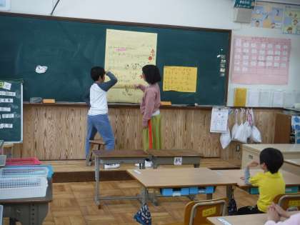 4月の誕生日会の様子を見ていただきました。自分たちでどんな会にするか話し合いプログラムを決めてすすめました。1年生もお姉さん・お兄さんと一緒に今何をしているのかわかるようにマークを動かしてくれました。