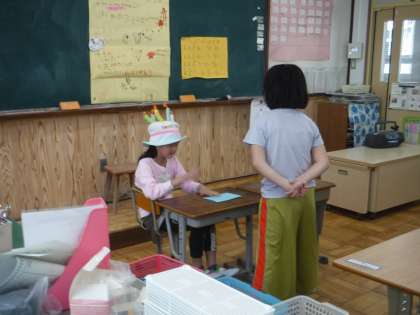 みんなでゲームをする時は,おうちの方にも入っていただき盛り上がりました。負けた時はインタビューに答えてもらいます。「○○くんのいいところは,どこですか?」とたずねる4年生。「笑顔です!」の答えにみんなにこにこでした。手作りのカードをプレゼントするときも「これからも同じ学年としてよろしく!」と言葉をかけて渡しました!最後に「こんな楽しい会をしてもらってうれしいです!これからもなかよくしてください!」という言葉で終わりました。