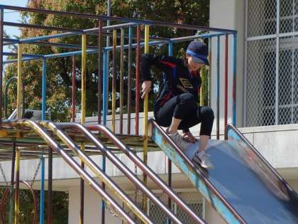 2年担任のお母さん先生でもあるF先生,説明中にいきなりスルスルと総合遊具に昇りだし,ヒョイと飛び降りたり,怖〜い滑り方をしてみたり。「どこが,だめなの?」と一つ一つ丁寧に指導をしています。