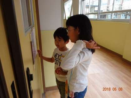 教室の前の看板を一生懸命に読んで,1年生に紹介しました。