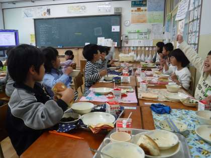 今日から給食交流に行きました!1年生は,1年1組です。行くとみんな「Hくん!」「待ってたよ!」と嬉しそうです。今日の献立は,チーズコッペパンとひじきのソティとてぼうまめのクリームシチューハッピーキャロット入りでした。みんな「おいしい!」「あっ,Hくんのシチューハッピーキャロットが入ってる!」と楽しい給食の時間でした。