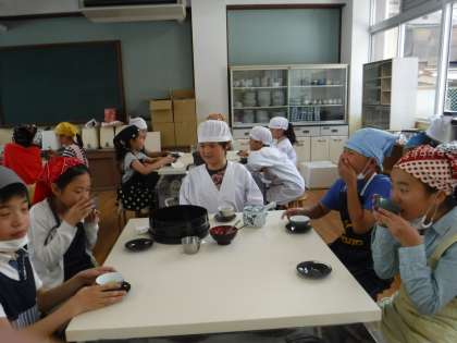 今日は,5年4組の家庭科の学習にそらいろの5年生の二人も一緒に学習しました。家族のだんらん「お茶をいれよう」です。I先生の話を真剣に聞いてお茶を入れました。最初は,緑茶です。お湯を沸かすところからで,コンロに火をつけるのは,「任せて!」と言っていました。