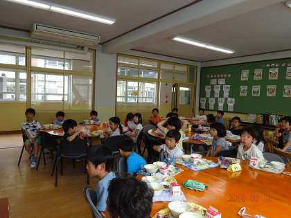 ランチルームで給食を食べました。丸いテーブルでみんなで楽しく給食を食べました。時間内にみんな食べられました。今日も食缶は空っぽです!