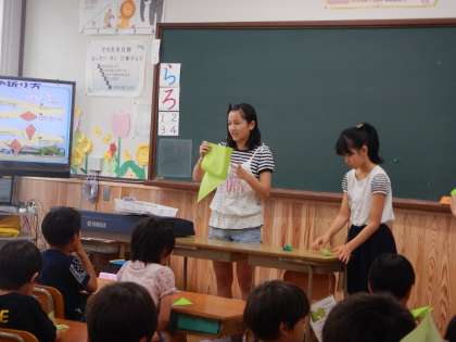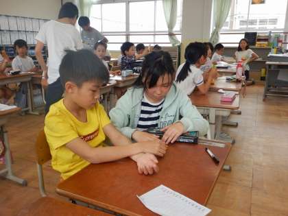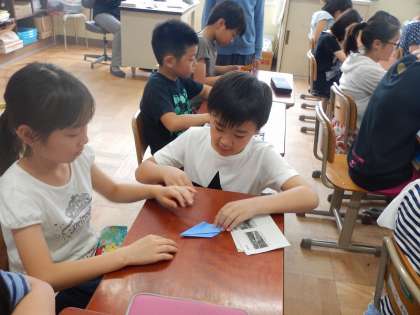 「困っている人手あげてね!」と声をかけています。前で見本を見せる担当と周りでサポートする担当に分かれています。