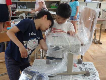 新聞紙やナイロン袋を使って教室のいろいろなものをつつみます。