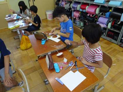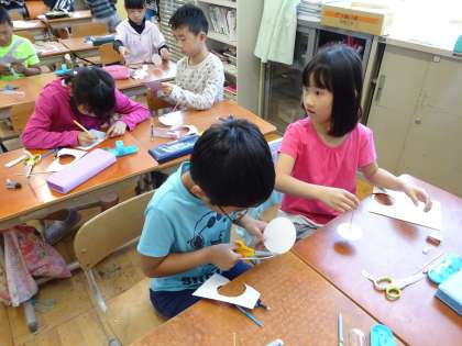 円と球の学習の導入でこまづくりをしました。こまに,しるしをつけて回すとしるしが円をえがきました。コンパスを使うのもとても楽しみにしています。上手にコンパスが使えるように練習していきたいと思います。