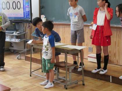 色んな遊びを考えたようです…こちらの班は「へんしんぱっ!」という遊びをしています。変身前と後で何が変わったかな…?廊下で変身中です…6年生が変身させています。6年生もどこを変身させるか考え中…