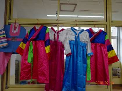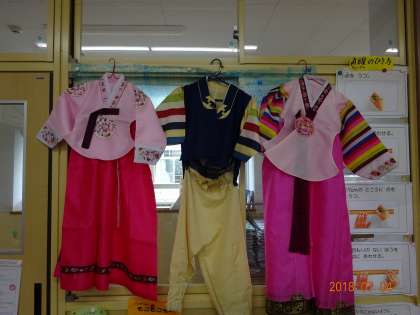「おとなりの国を知ろう」で,韓国・朝鮮のことを学習しました。チマチョゴリやパジチョゴリを見ると,「きれいな色!」「すご〜い!」「着てみたい!」という声が出ました。