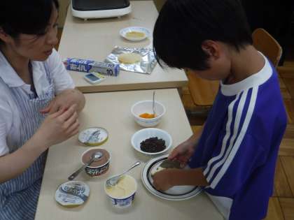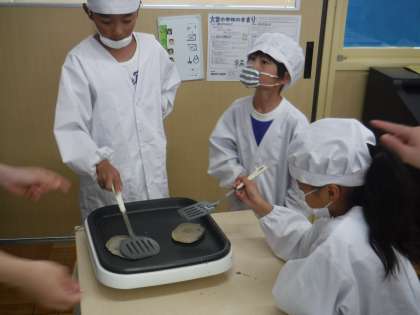 1年生は,卵を割る担当です。とても上手になりました。クレープを焼くのは難しいのですがみんな薄く上手に焼けました!