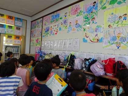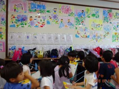 「あじさいとわたし」の作品の鑑賞をしました。友達の作品のすてきなところや,頑張っているところなどをじっくり見ました。教室が美術館になりました。