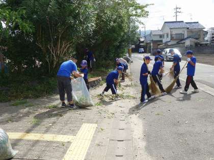 学校創立百周年の記念樹の周囲も,ずいぶん草が生えていました。夏休み中に一度草抜きをしたのですが,さんざんな状態になっていましたが,ユニフォーム姿の子どもたちや保護者の皆さんが,がんばって抜いてくださいました。